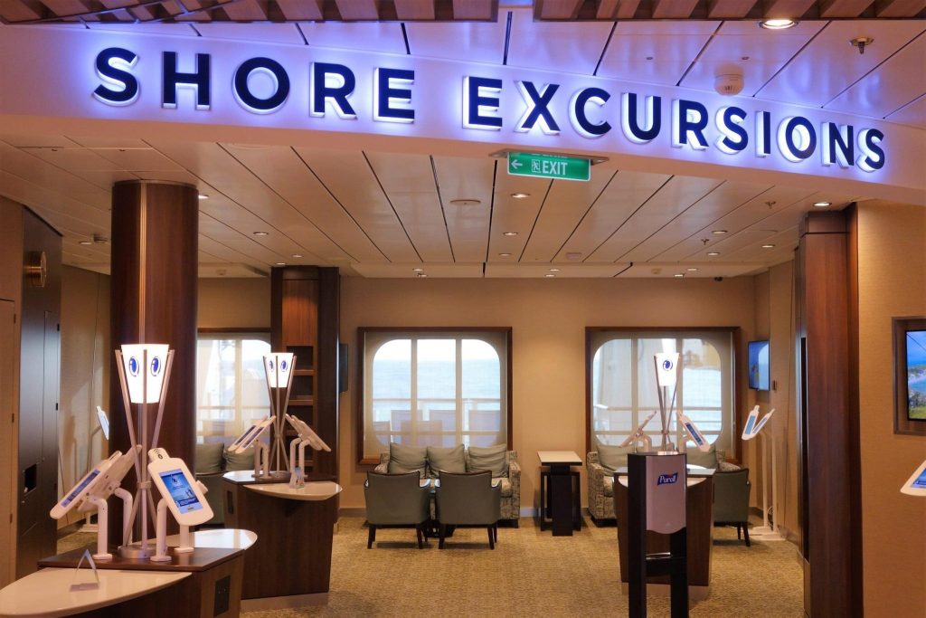 Ship excursions are bundled into the cruise app, daily schedule, and onboard announcements.
